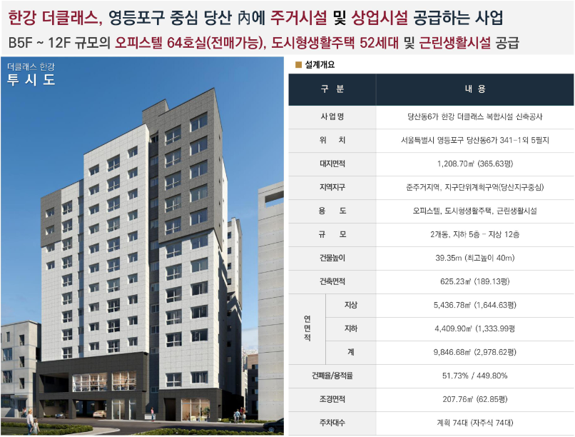 ‘당산역 더클래스 한강’은 성안산업개발이 시공하고, 당산동6가 신축판매가 시행을 맡은 프로젝트입니다. 총 부지 면적은 366평, 연면적은 약 2,978평으로 구성되며, 용적률은 449.80%로 비교적 높은 편입니다.