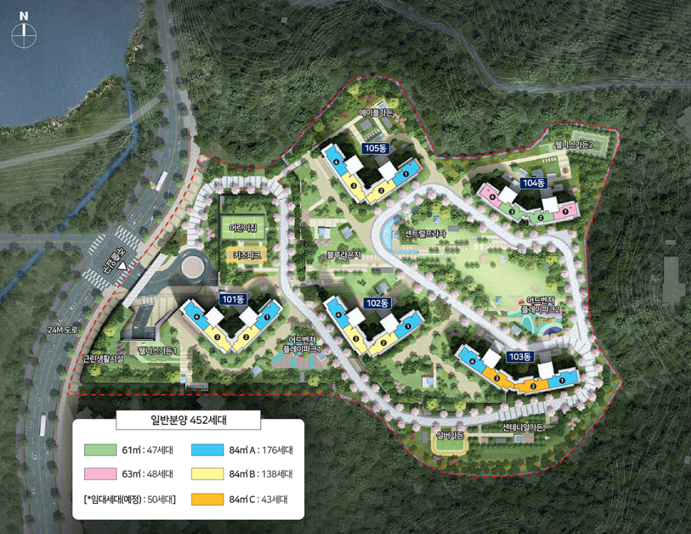 숲이 어우러진 자연 친화적인 주거 환경을 강조하고 있습니다. 이는 자녀를 둔 가정이나 은퇴 후 조용한 생활을 원하는 수요층에게 강력한 메리트로 작용할 수 있습니다.