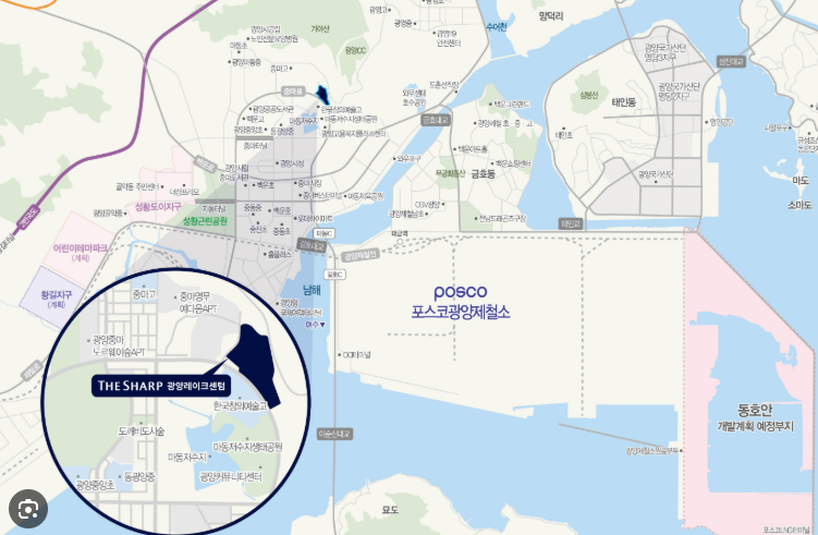 단지는 광양 마동 주거 중심지</strong에 위치하며, 인근에는 마동 호수공원과 백운산 자락이 있어 자연 친화적인 주거환경을 제공합니다. 또한, 광양제철소와 포스코 관련 협력업체들이 인근에 위치해 있어 직주근접 수요도 탄탄합니다.
