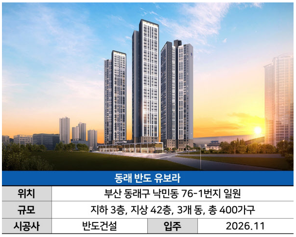 ‘동래 반도유보라’는 부산에서도 전통적인 주거선호지인 동래구 낙민동에 위치해 있습니다. 입지 자체는 교육, 상권, 교통 등에서 나쁘지 않지만, 경쟁 단지들과 비교해 다음과 같은 약점이 존재합니다: