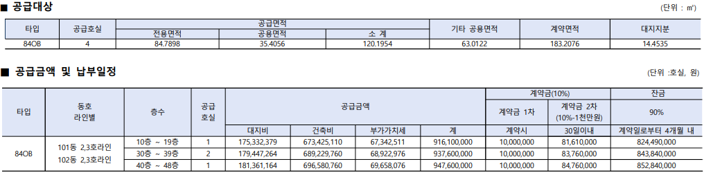 분양가는 채당 9억 4,760만 원으로 책정되었으며, 계약 조건은 계약금 10%(1차분 1,000만 원 정액제) + 잔금 90% 구조입니다. 청약 일정은 2025년 9월 17~18일로 예정되어 있고, 청약 신청금은 100만 원, 입주 예정일은 2026년 1월입니다.