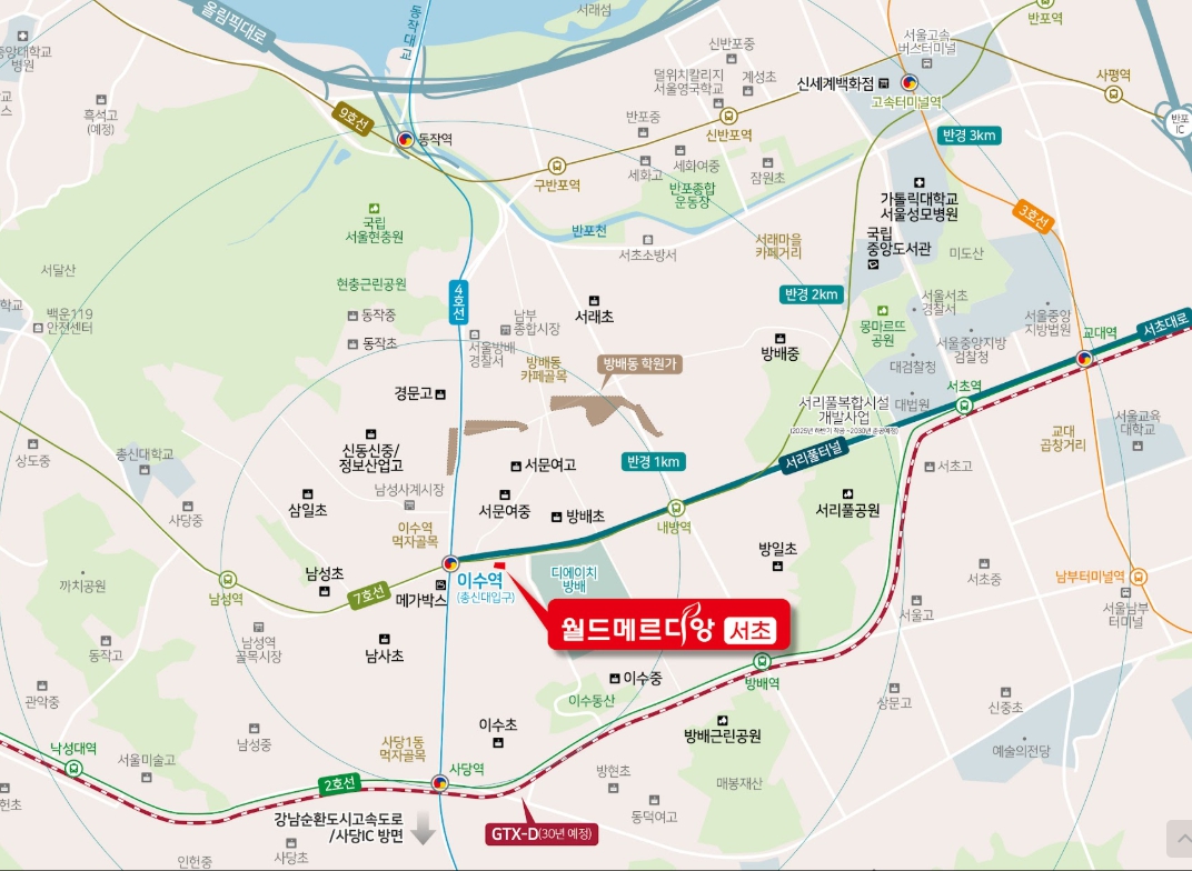 방배동은 전통적으로 주거 선호도가 높은 지역으로, 학군·교통·생활 편의시설이 잘 갖춰져 있어 안정적인 수요층이 존재합니다. 특히 이번에 분양 예정인 ‘월드메르디앙 서초’는 지하철 2호선 방배역과 가까운 입지로 뛰어난 대중교통 접근성을 자랑하며, 강남권으로의 출퇴근도 용이합니다. 또한 주변에는 우수한 초·중·고교가 밀집해 있어 학군 프리미엄도 기대할 수 있습니다.