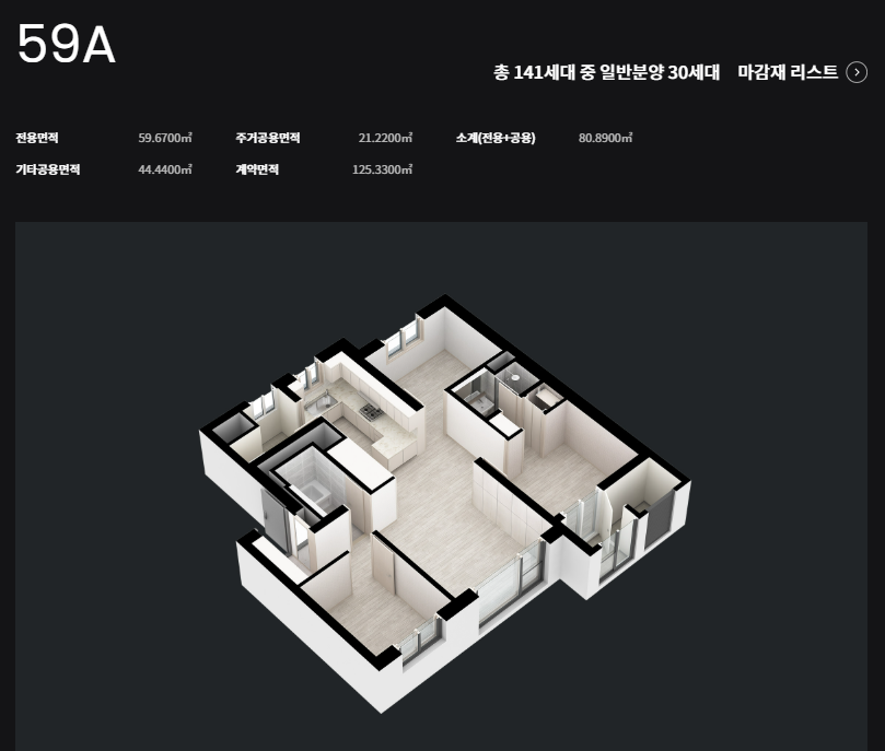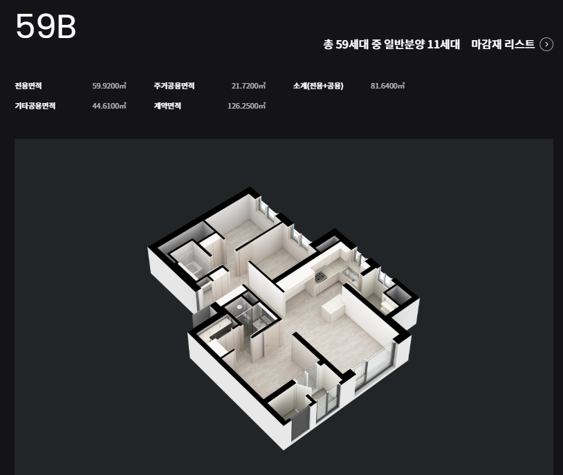 - 전용 59㎡: 공급면적 약 24~25평, 분양가 10억8,890만원 ~ 11억460만원