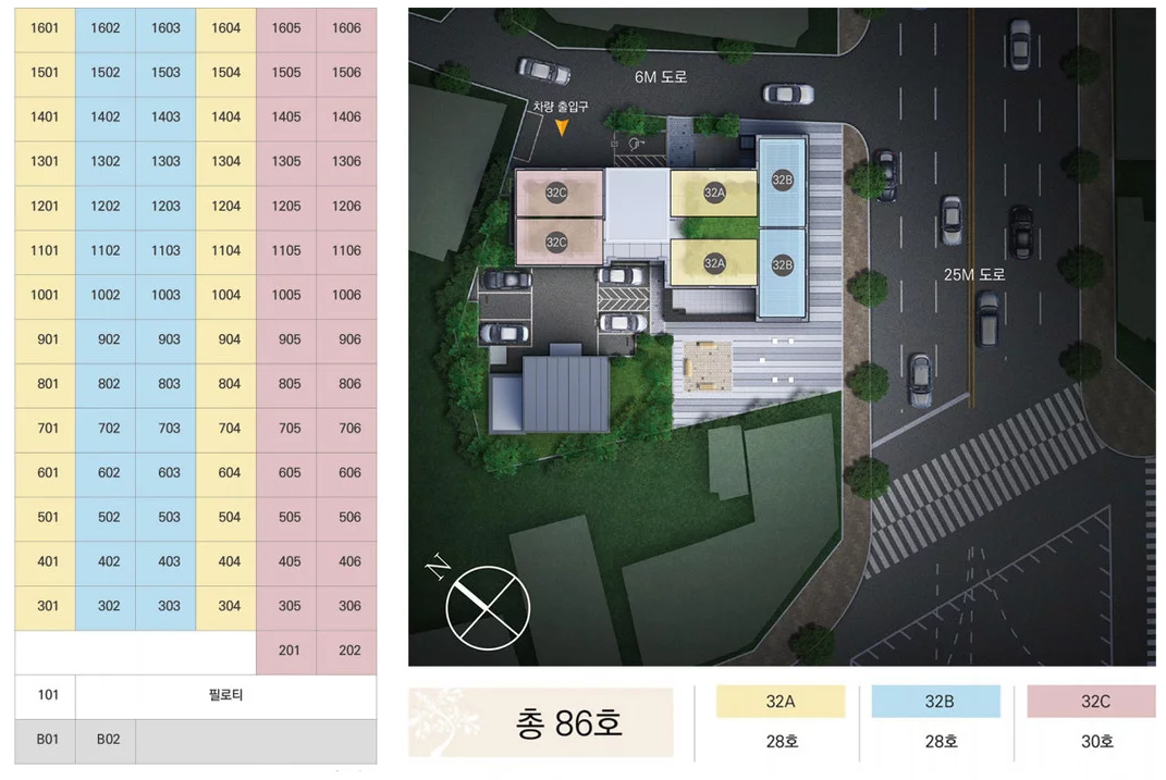 또한, 1개동 구성(지하 2층 ~ 지상 16층)의 단일 타워로 설계되어 있어 단지 밀도가 낮고, 층간 소음 및 프라이버시 확보 면에서 유리한 구조입니다. 이는 실제 생활 만족도를 높이는 요소로 작용할 수 있습니다.