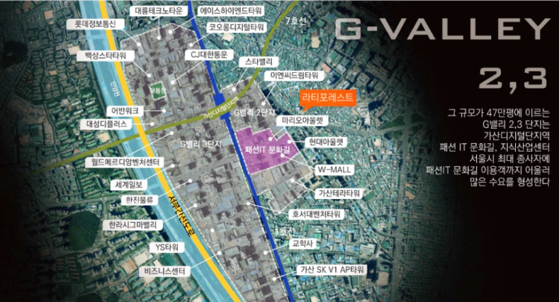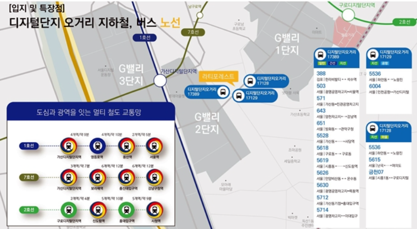 서울G-밸리 라티포레스트는 구로디지털단지와 가산디지털단지, 일명 G밸리라고 불리는 대한민국 대표 산업 클러스터와 매우 가까운 거리에 위치해 있습니다. 이 지역은 수많은 IT·스타트업 기업들이 밀집한 상업·산업 복합지로, 젊은 직장인과 1~2인 가구의 유입이 매우 활발한 곳입니다.