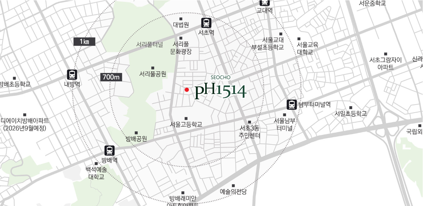 ‘서초 PH1514’는 서울 서초구 서초동 1514-2번지에 위치한 소형 도시형생활주택으로, 제2종 일반주거지역에 해당합니다. 연면적 524평, 총 2개 동으로 구성되며, 지하 1층부터 지상 6층까지 40가구가 공급됩니다. 전용면적은 25㎡~27㎡ 수준의 소형 평형대이며, 이로 인해 젊은 직장인 및 1인 가구 중심의 임대수요가 매우 풍부할 것으로 보입니다. 특히 인근에 서초역과 교대역 등 주요 교통 인프라가 잘 갖춰져 있어 출퇴근 접근성이 뛰어나며, 법조타운, 강남 업무지구와의 접근성 또한 큰 장점입니다.