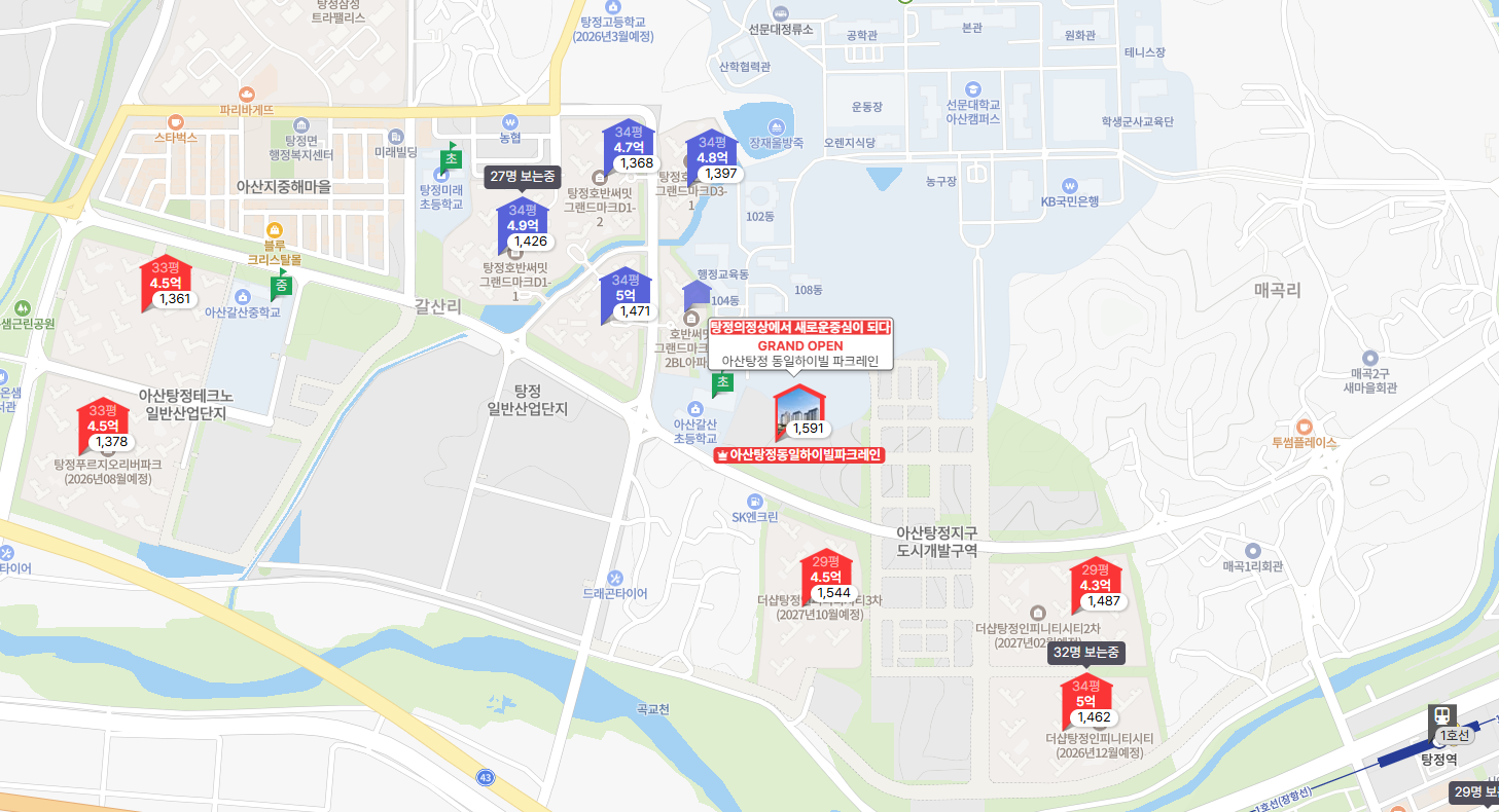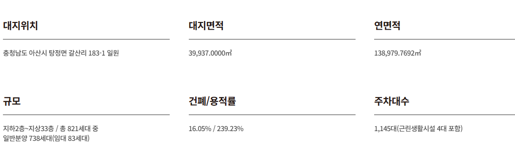 커뮤니티 시설도 주목할 만합니다. 탕정 일대 신도시 개발과 맞물려 브랜드 프리미엄, 대단지 메리트, 쾌적한 주거 환경을 기대할 수 있으며, 장기적 가치 상승 가능성이 높은 곳입니다.
