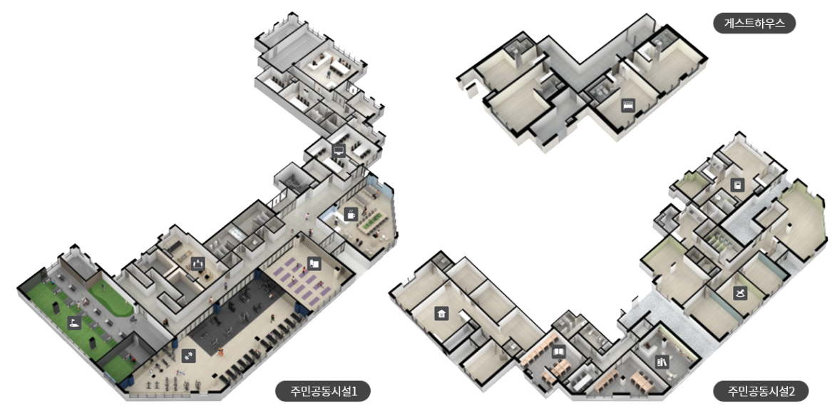 단지 내부에는 호텔식 생활 인프라가 반영된 커뮤니티 시설이 대거 포함됩니다. 주요 시설로는 오픈 라이브러리, 사우나, 게스트 하우스, 오픈키친, 파티룸, 계절창고 등이 있으며, 입주민을 위한 조식 서비스도 계획되어 있어 고급 거주 환경을 제공합니다.