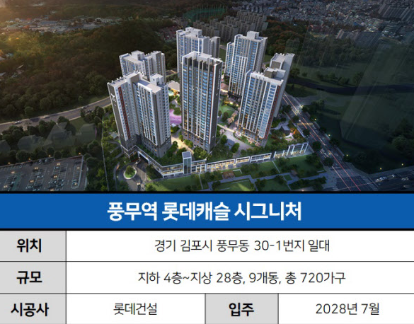 경기도 김포시 풍무동 30-1 일대에 조성된 신규 분양 단지 ‘풍무역 롯데캐슬 시그니처’가 최근 청약 결과를 발표했습니다. 이번 단지는 롯데건설이 시공하고, 무궁화신탁이 시행하는 프로젝트로 총 720가구 규모의 대단지입니다.