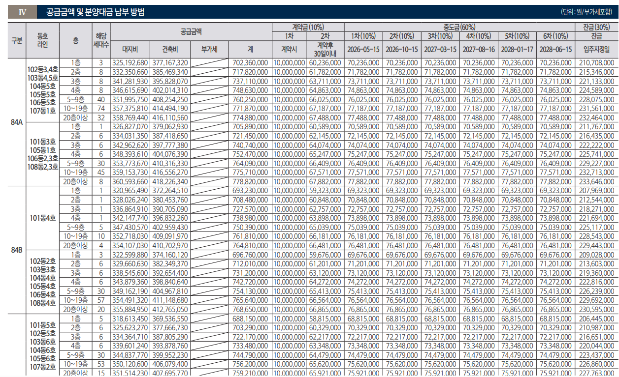 - 전용 84㎡: 7억5,994만~7억7,882만원