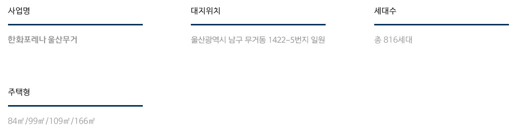 울산 남구 무거동 1422-5번지, 옛 한화케미칼 사택 부지에 ‘한화포레나 울산무거’가 들어섭니다. 총 지하 3층~지상 25층, 8개동, 816가구 규모로 조성되며, 전용면적은 84·99·109·166㎡의 다양한 타입을 제공합니다.