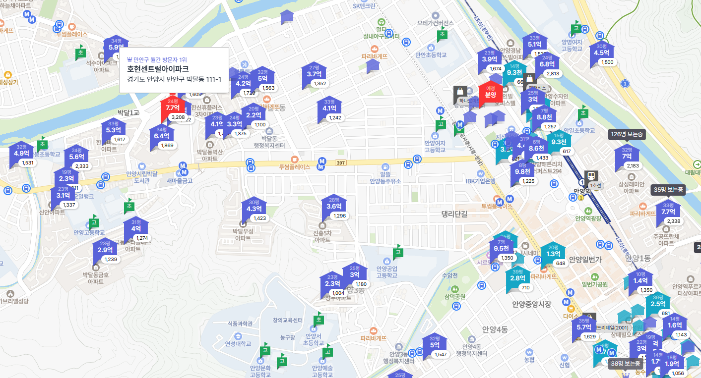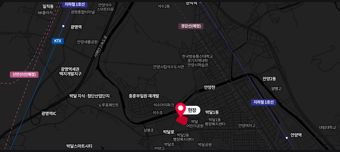 호현 센트럴 아이파크가 들어서는 박달2동은 서울 금천구, 광명과 가까운 위치로 뛰어난 서울 접근성을 자랑합니다. 특히 1호선 안양역, 안양 중앙시장, 안양천 인접 등 생활·교통 인프라가 고루 갖춰져 있어 직주근접 실수요층에게는 매우 매력적인 입지입니다.