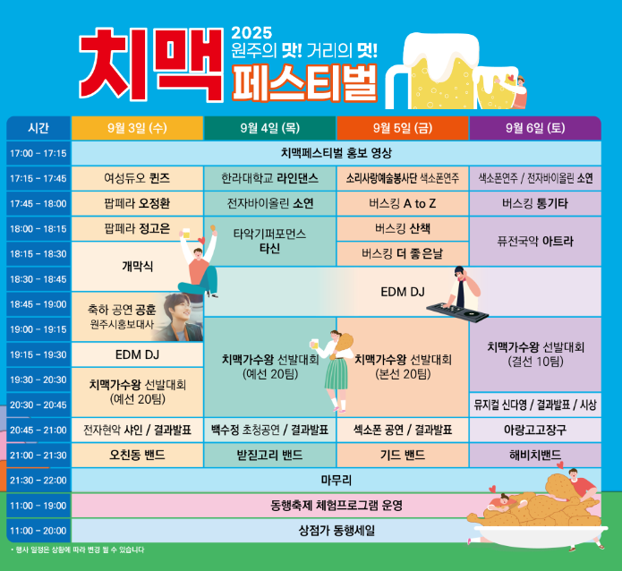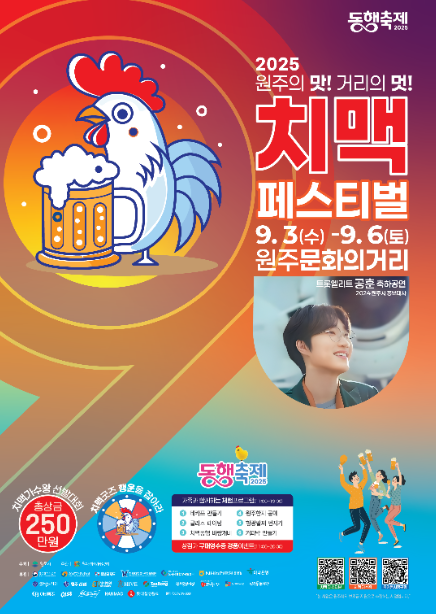 2025년 원주 문화의 거리 치맥 축제! 맛있는 음식과 다채로운 공연, 그리고 풍성한 체험 프로그램으로 가득한 축제에서 잊지 못할 추억을 만들어보세요! 가족, 친구, 연인과 함께 방문하여 즐거운 시간을 보내시길 바랍니다. 9월, 원주 문화의 거리에서 만나요!