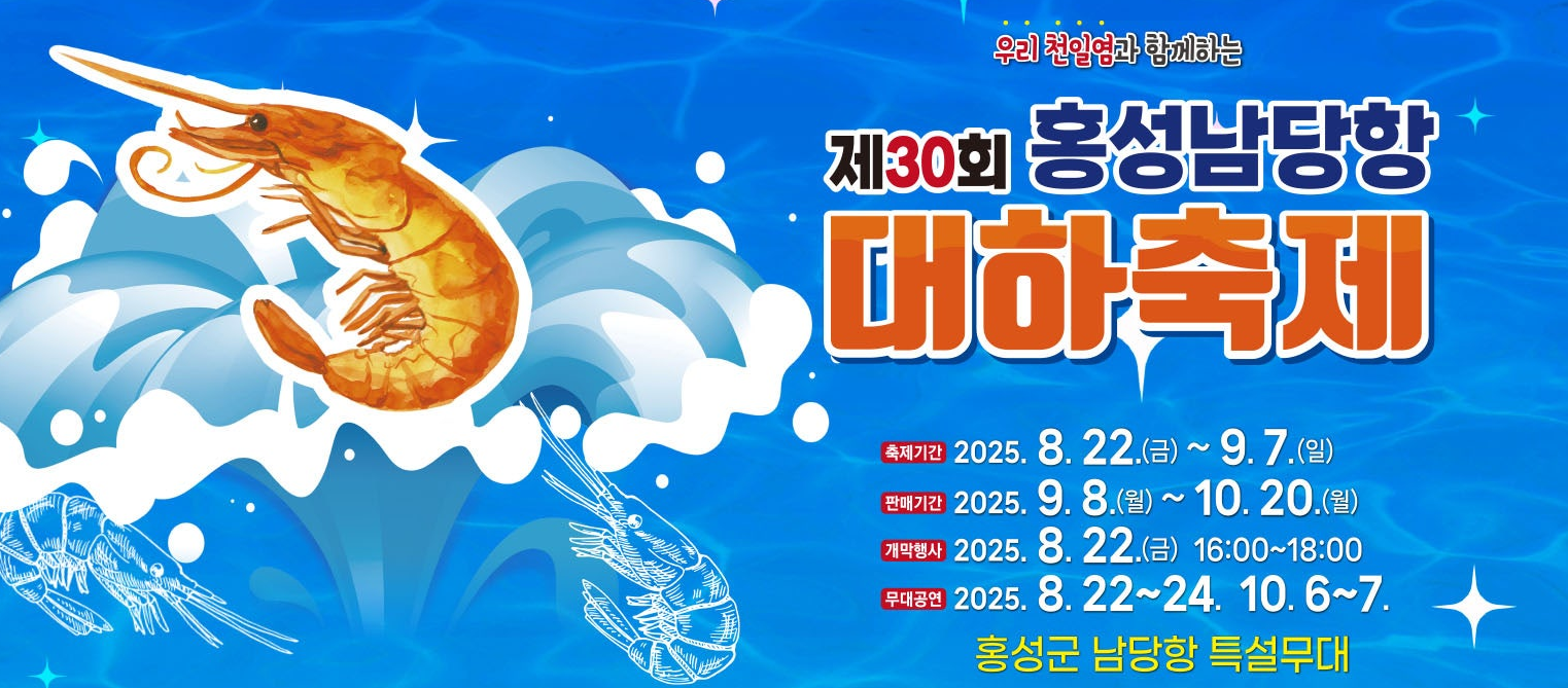 여름의 끝자락과 깊어가는 가을, 홍성 남당항 대하축제에서 미식과 체험, 아름다운 자연을 만끽하며 특별한 추억을 만들어보세요. 싱싱한 대하의 고소함과 서해의 아름다움이 여러분을 기다립니다! 2025년 가을, 홍성 남당항으로 떠나 잊지 못할 추억을 만들어보세요!